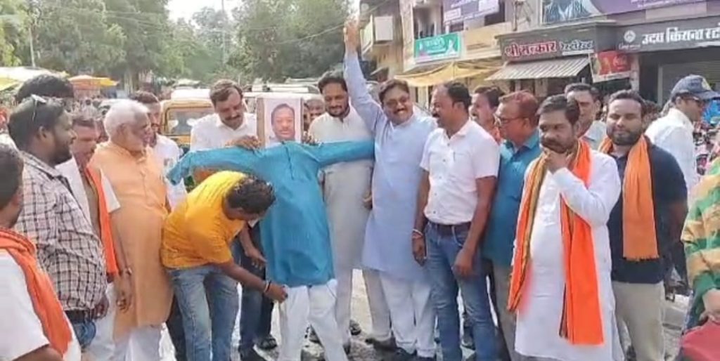 झाबुआ…जिला भाजपा द्वारा भारत के लोकप्रिय प्रधानमंत्री नरेन्द्र मोदी के खिलाफ कांग्रेसी विधायक कांतिलाल भूरिया द्वारा अमर्यादित व अशोभनीय टिप्पणी को लेकर जिला भाजपा एवं देवझरी ग्रामीण मंडल द्वारा भाजपा जिलाध्यक्ष भानु भुरिया के नेतृत्व में कांतिलाल भूरिया का पुतला दहन किया गया उक्त जानकारी देते हुए जिला भाजपा मिडिया प्रभारी योगेन्द्र नाहर ने बताया कि पिछले दिनों एक कार्यक्रम में झाबुआ के कांग्रेसी विधायक कांतिलाल भूरिया ने भारत के यशस्वी एवं लोकप्रिय प्रधानमंत्री श्री नरेन्द्र मोदी के खिलाफ अमर्यादित एवं अशोभनीय टिप्पणी कि थी इसी को लेकर आज जिला भाजपा एवं देवझरी ग्रामीण मंडल द्वारा झाबुआ बस स्टैंड स्थित फव्वारा चौक पर कांतिलाल भूरिया का पुतला दहन किया गया इस अवसर पर कांतिलाल भूरिया मुर्दाबाद एवं माफी मांगो कांतिलाल के नारों से गूंजायमान हुआ समुचा फव्वारा चौक तथा भाजपा ने कांतिलाल भूरिया से सार्वजनिक रूप से माफी की मांग की इस अवसर पर भारतीय जनता पार्टी के जिला महामंत्री सोमसिंह सोलंकी, शांतिलाल बिलवाल दौलत भावसार, इरशाद कुरेशी, बबलु सकलेचा, किर्ति भावसार, सुनिता गोविन्द अजनार,दैवझरी मंडल अध्यक्ष सुरभान गुण्ढिया सहित भारतीय जनता पार्टी के सैकड़ों ज्येष्ठ श्रेष्ठ कार्यकर्ता उपस्थित थे