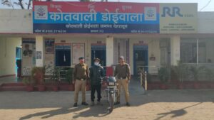 पुलिस द्वारा लगातार किये जा रहे प्रयासों से मुखबिर की सूचना पर 20 फरबरी 2026 की रात्रि मे पुलिस टीम द्वारा चौकी गेट हर्रावाला बैरियर पर चैकिंग के दौरान अभियुक्त अर्जुन थापा पुत्र श्री रामलाल थापा निवासी शिवलोक कॉलोनी, गली न0- 07, थाना रायपुर, देहरादून, उम्र- 24 वर्ष को घटना में चोरी की गयी मो0सा0 सं0- UK07Y-5551 (स्पलेन्डर प्लस) के साथ गिरफ्तार किया गया।
